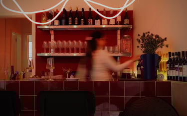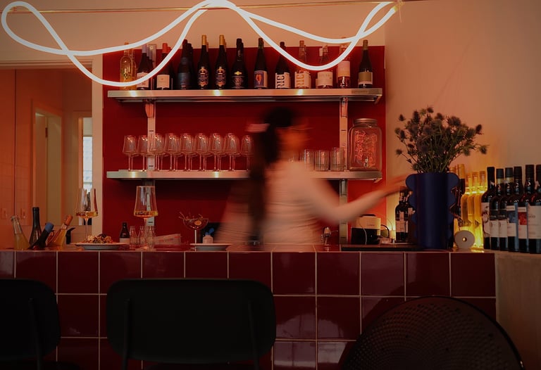 Um wine bar acolhedor e contemporâneo, projetado com atenção aos detalhes. A iluminação se destaca, e cada elemento, da escolha dos materiais aos acabamentos, foi pensado para criar um ambiente relaxante e convidativo, perfeito para apreciar um bom vinho.