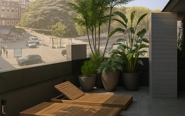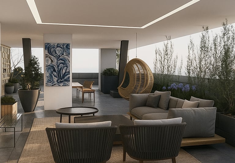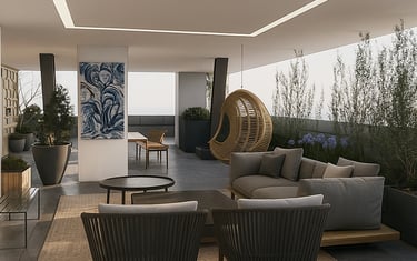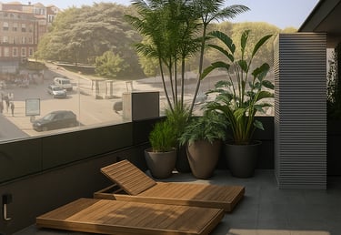 Um terraço criado para lazer e descanso, onde o verde das plantas e a vista para a cidade proporcionam um refúgio tranquilo em meio ao ritmo urbano.