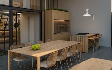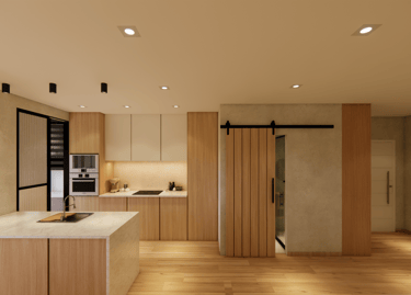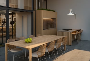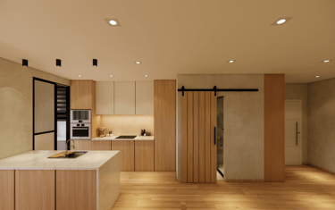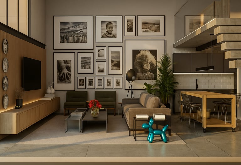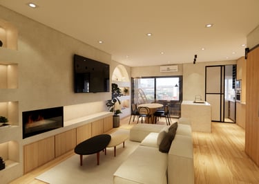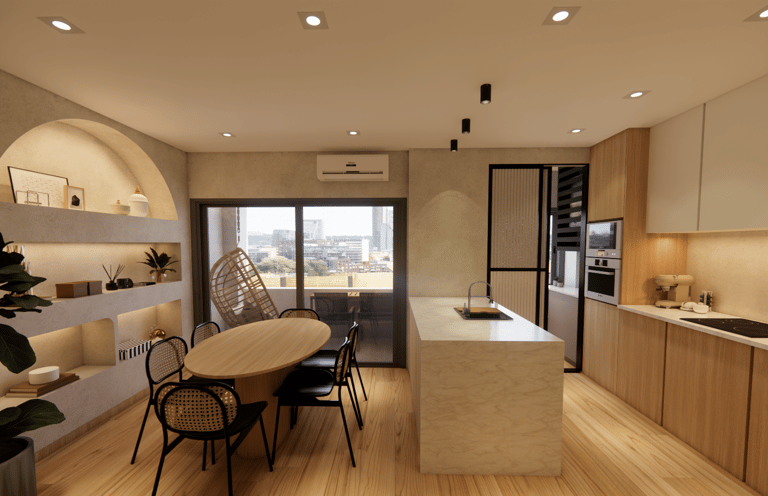 Com uma área social integrada, este espaço combina tons neutros, madeira e iluminação cuidada, criando um ambiente moderno, funcional e acolhedor.